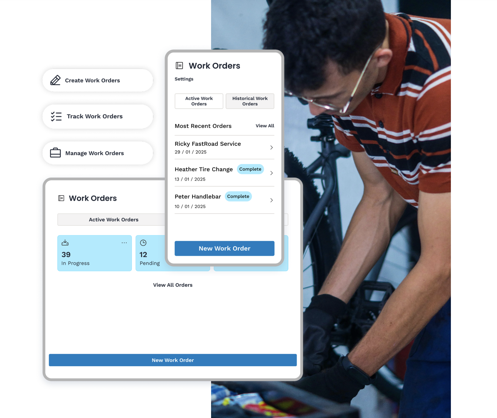 Work orders and repairs with a dedicated, bike-specific interface.